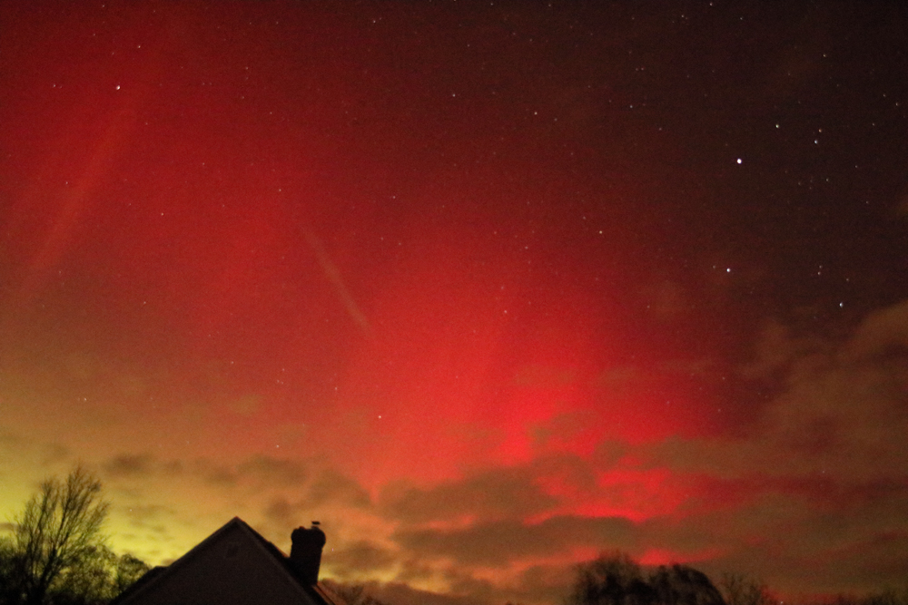During the evening of this Veterans Day, a nice aurora appeared in the skies over Connecticut. This aurora was predicted earlier in the day because of strong solar activity, and many people went out to look for it. My fellow members of the Astronomical Society of New Haven observed and photographed this event from various locations around the state. As usual, I did my observing from my backyard in Killingworth. From here, the dominant colors were reds and greens.