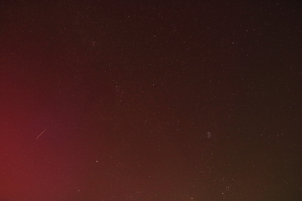 This aurora occurred during the early morning hours of August 12, 2024. A Perseid meteor is seen to the lower left side of the image.